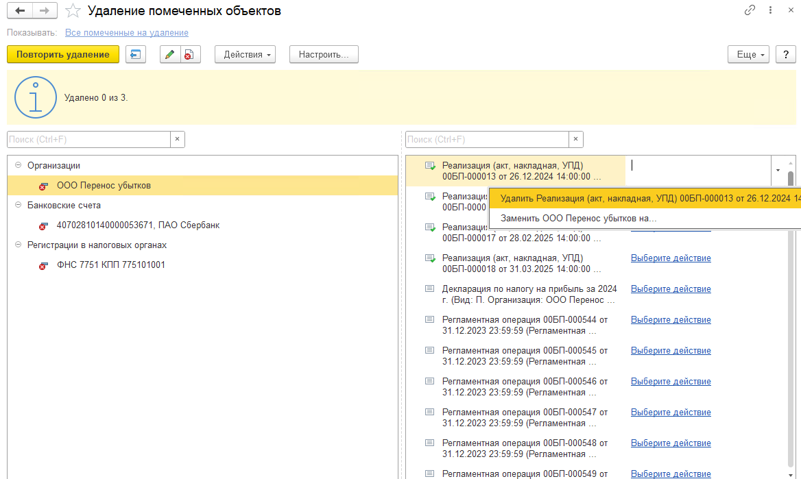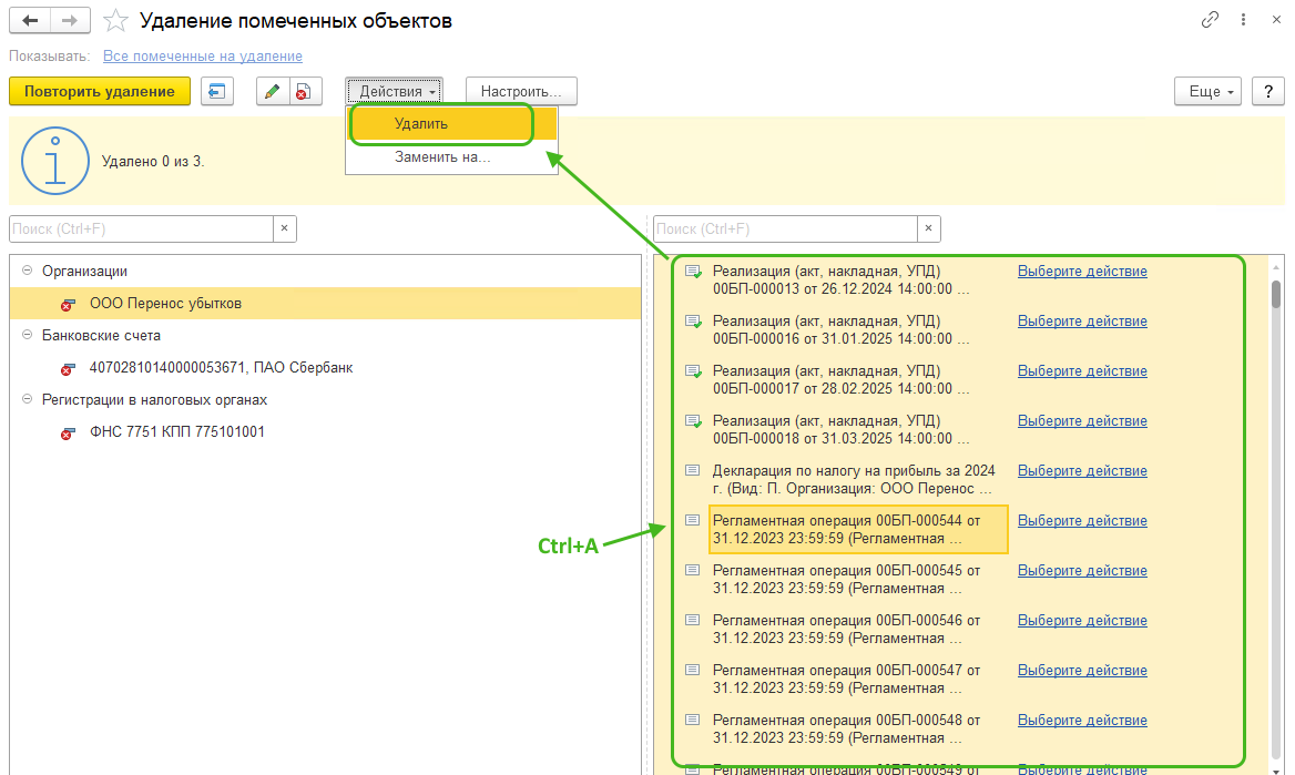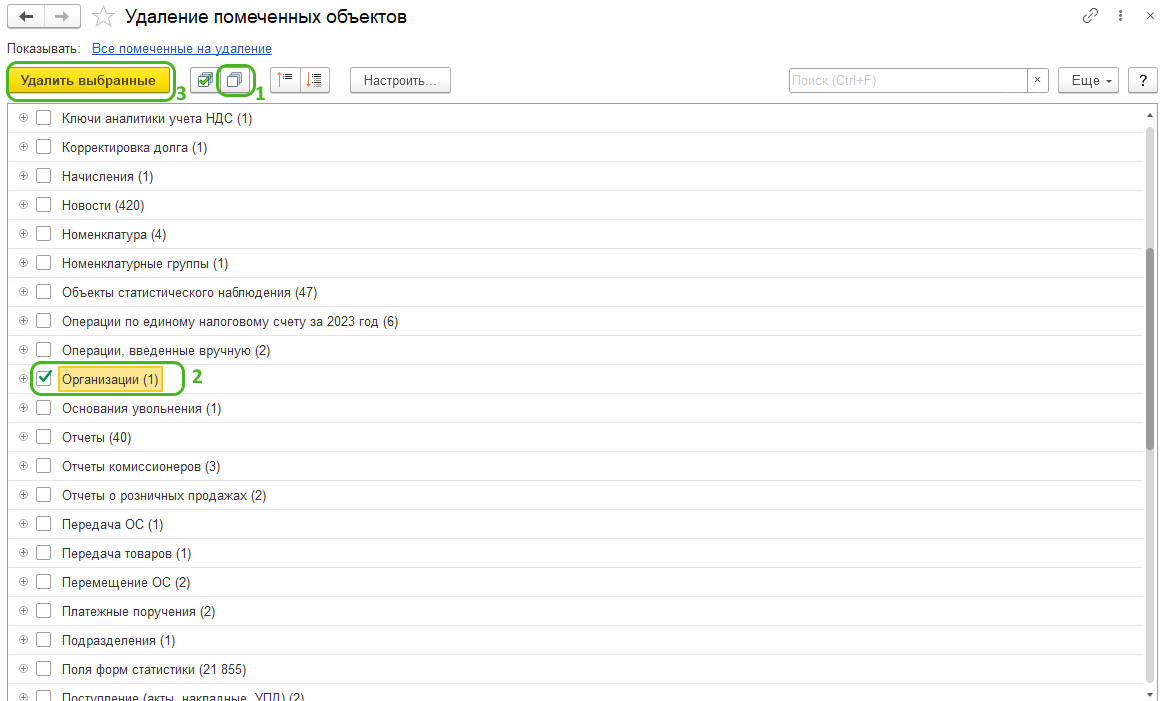 Снимите галки со всех помеченных на удаление объектов, кроме организации и нажмите кнопку Удалить выбранные, подтвердите удаление и дождитесь окончания обработки.