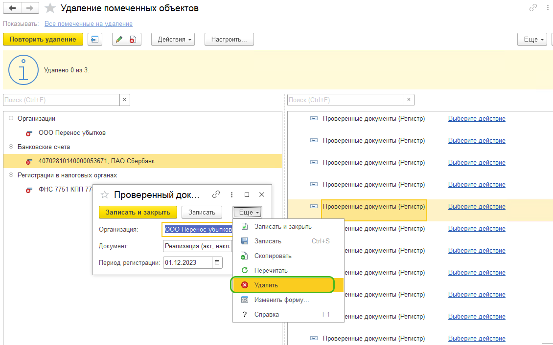 Обращаем внимание, что при удалении может потребоваться снять дату запрета изменений, если она установлена (раздел Администрирование - Настройки пользователей и прав - Даты запрета изменений)