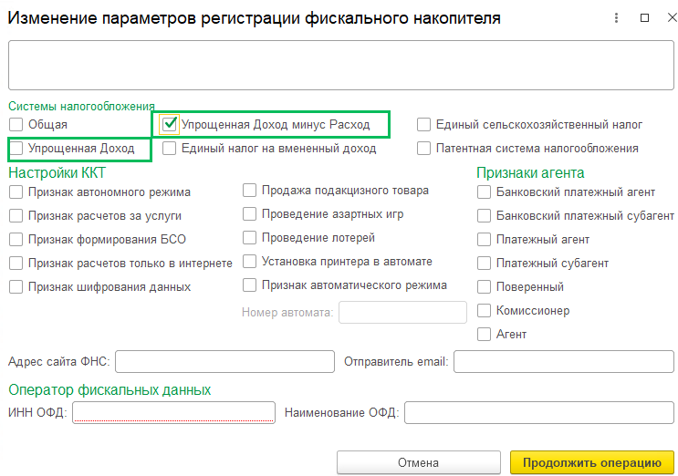 В параметрах регистрации фискального накопителя проверьте правильность установленной системы налогообложения. Администрирование – Подключаемое оборудование – Операции с фискальным накопителем – Изменение параметров регистрации. Настройки такие же, как и при применении обычной УСН.
