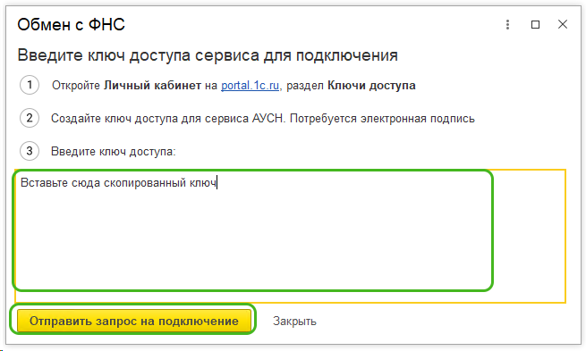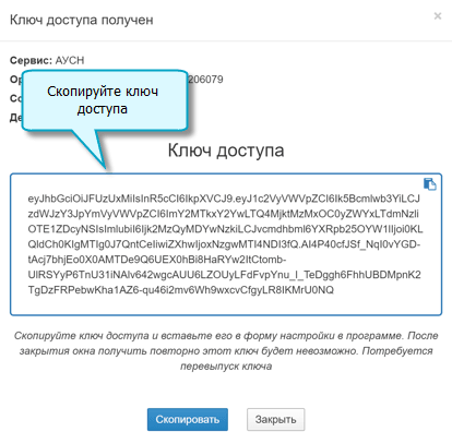 После создания скопируйте ключ доступа и введите его в 1С в 3-ем пункте подключения сервиса АУСН и отправьте запрос на подключение
