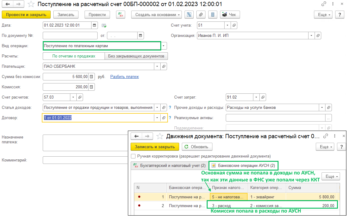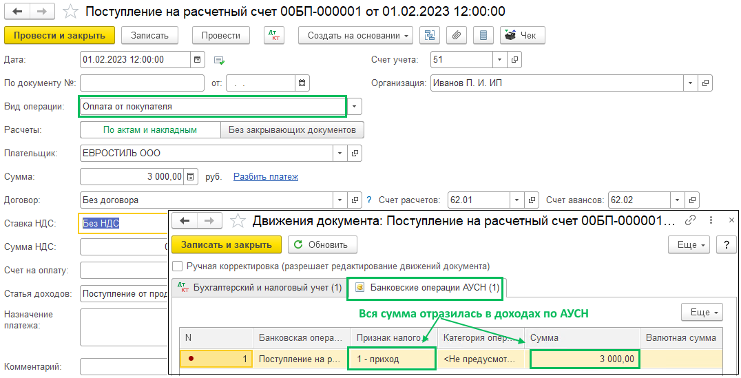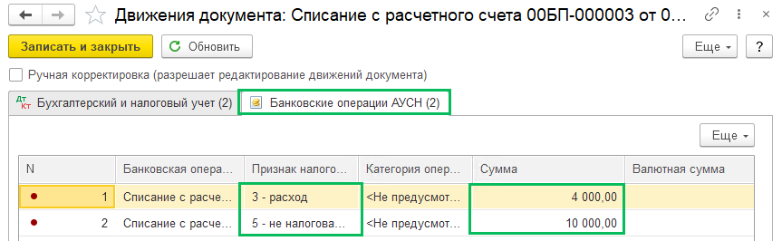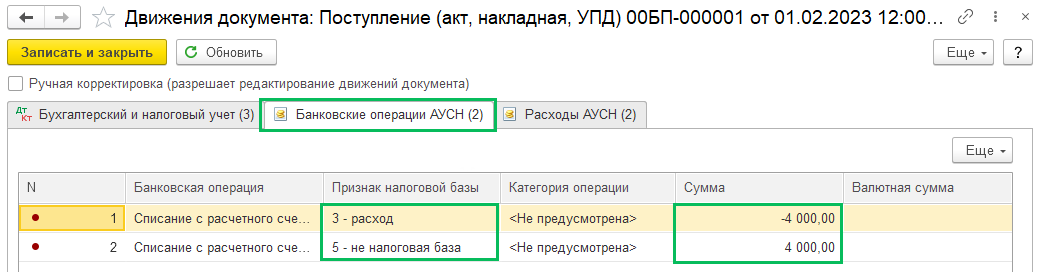 Помимо проводок в банковских выписках формируются записи по регистру Банковские операции АУСН, обращайте внимание на поля Признак налоговой базы и Сумма