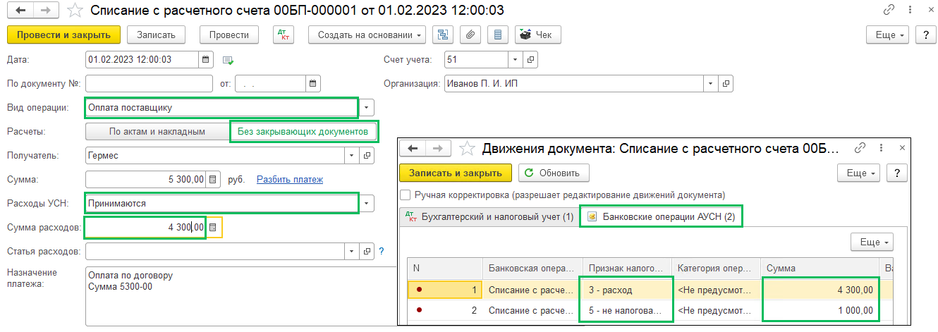 При использовании расчетов Без закрывающих документов появляется поля Расходы УСН (Принимаются/Не принимаются) и Сумма расхода (укажите ту сумму, которую хотите отнести на расходы по АУСН)
