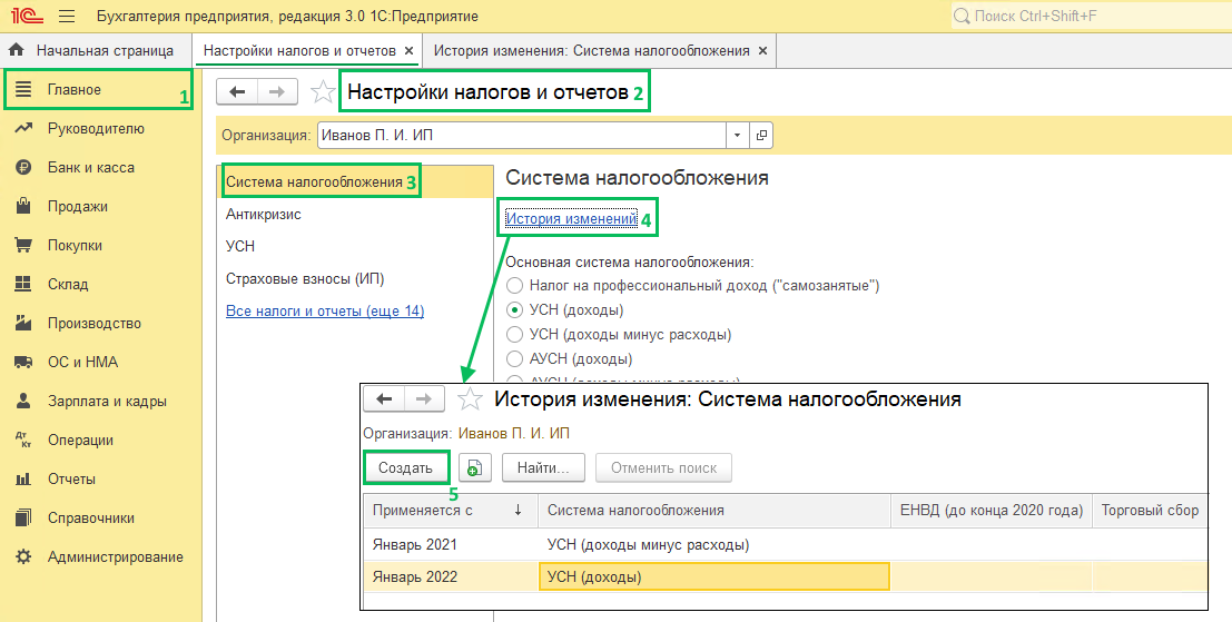 Для перехода в программе на АУСН зайдите в раздел Главное – Налоги и отчеты – Система налогообложения. Изменять настройки системы налогообложения мы рекомендуем через гиперссылку История изменений – Создать. И создайте новую настройку с нужной даты.