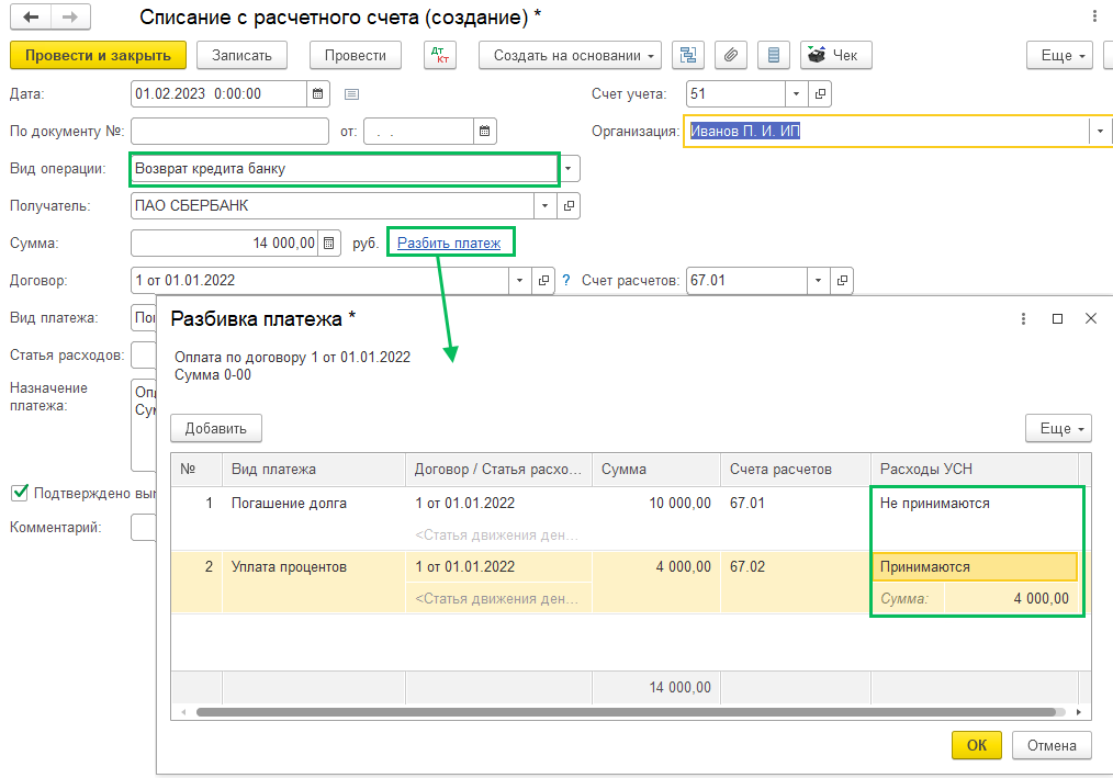 При возврате кредита банку (Списание с расчетного счета с видом операции Возврат кредита банку) для того, чтобы отразить сумму погашения долга в расходах АУСН, а проценты не отражать в расходах, воспользуйтесь гиперссылкой Разбить платеж рядом с суммой. И разбейте платеж на две части, для одной укажите, что расходы принимаются, а для второй кажите что расходы не принимаются