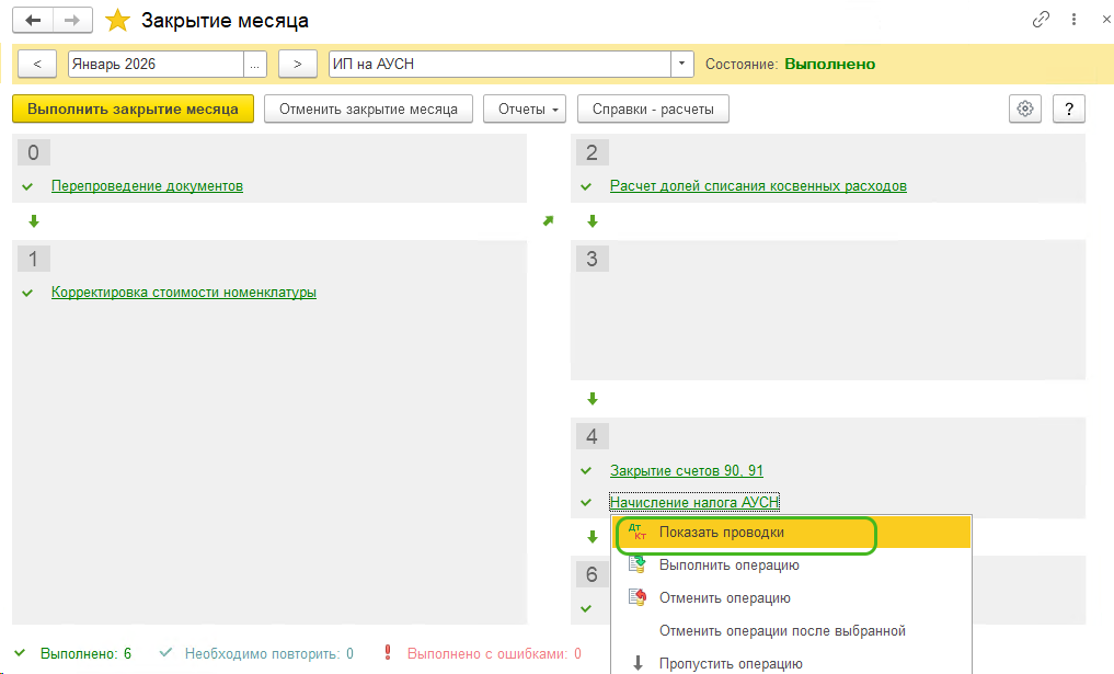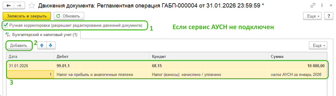 В 1С Бухгалтерия предприятия в помощнике Закрытие месяца (Операции – закрытие месяца) в 4 разделе есть регламентная операция Начисление налога АУСН. Если сервис 1С АУСН не подключен, то пользователю необходимо вручную начислить налог в этой операции. Для этого нажмите Показать проводки, установите галку Ручная корректировка и по кнопке Добавить создайте проводку Дт 99.01.1 Кт 68.15 по начислению налога за отчетный месяц, укажите сумму по данным ФНС. Записать и закрыть