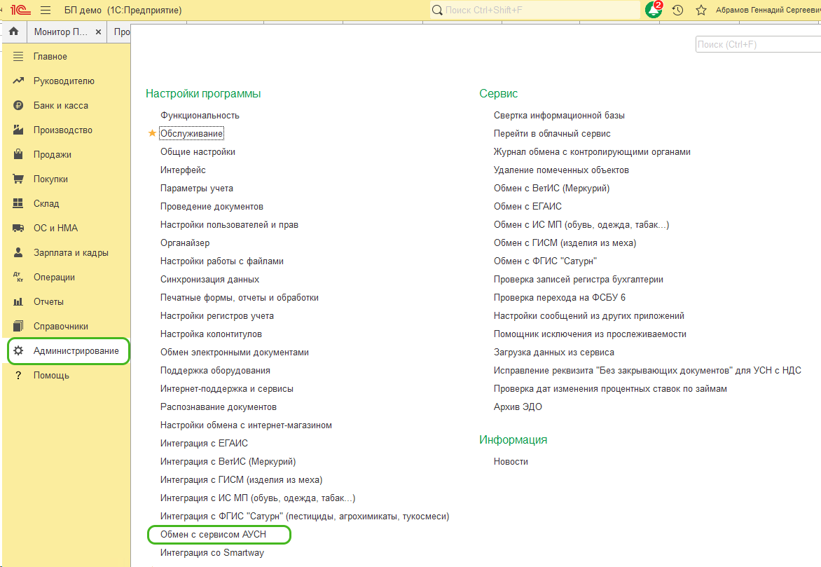 Для настройки и работы с сервисом потребуется ЭЦП, которая дает действовать от имени организации или ИП. Подключение происходит из рекламного баннера на начальной странице, в банковских выписках или в разделе Администрирование – Настройки программы – Обмен с сервисом АУСН