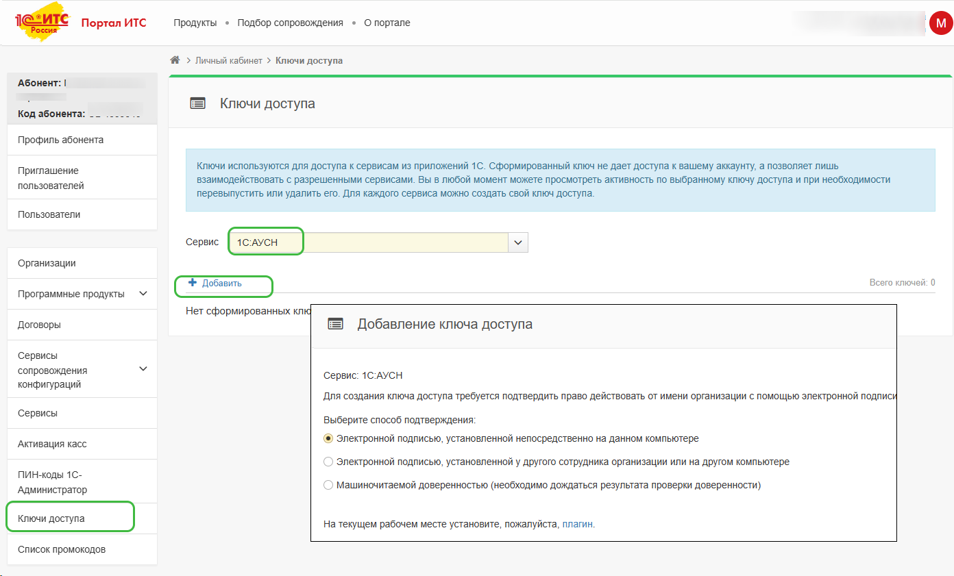 Нажмите на кнопку Подключить и следуйте инструкции: перейдите на сайт портала ИТС в раздел Ключи доступа – Добавление ключа доступа.