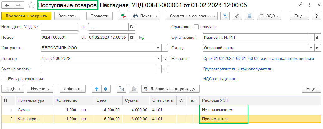 В данном случае настройка отражения денежных средств в расходах производится из документа Поступления (Покупки – Поступление (акты, накладные, УПД)) в табличной части в колонке Расходы УСН (Принимаются/Не принимаются)