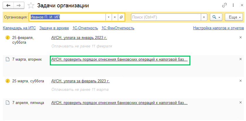Чтобы выполнить проверку, пройдите в раздел Главное – Задачи организации и перейдите в задачу АУСН, проверить порядок отнесения банковских операций к налоговой базе. Сравнить эти данные нужно с суммами в личном кабинете вашего банка.