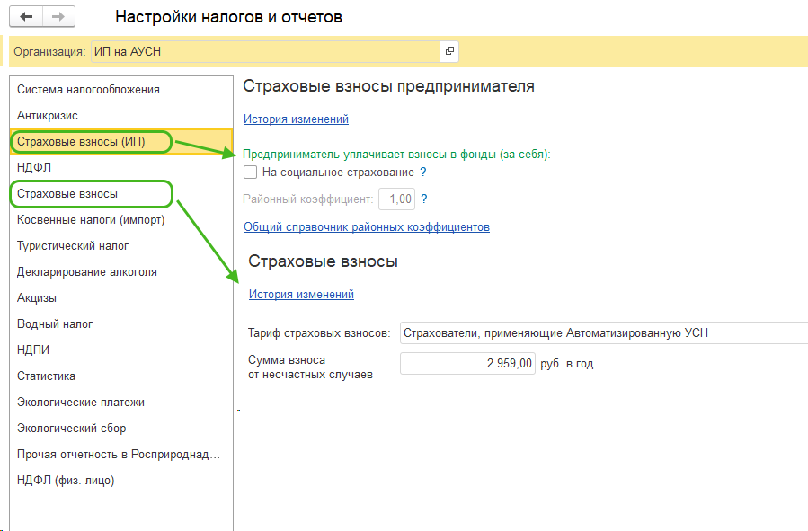 После изменения системы налогообложения на АУСН автоматически будет изменены настройки во вкладках Страховые взносы (ИП) и Страховые взносы. Страховые взносы ИП за себя 0% при применении АУСН, Тариф страховых взносов изменился на "Страхователи, применяющие Автоматизированную УСН" (0%). Сумма страховых взносов от несчастных случаем устанавливается автоматически.