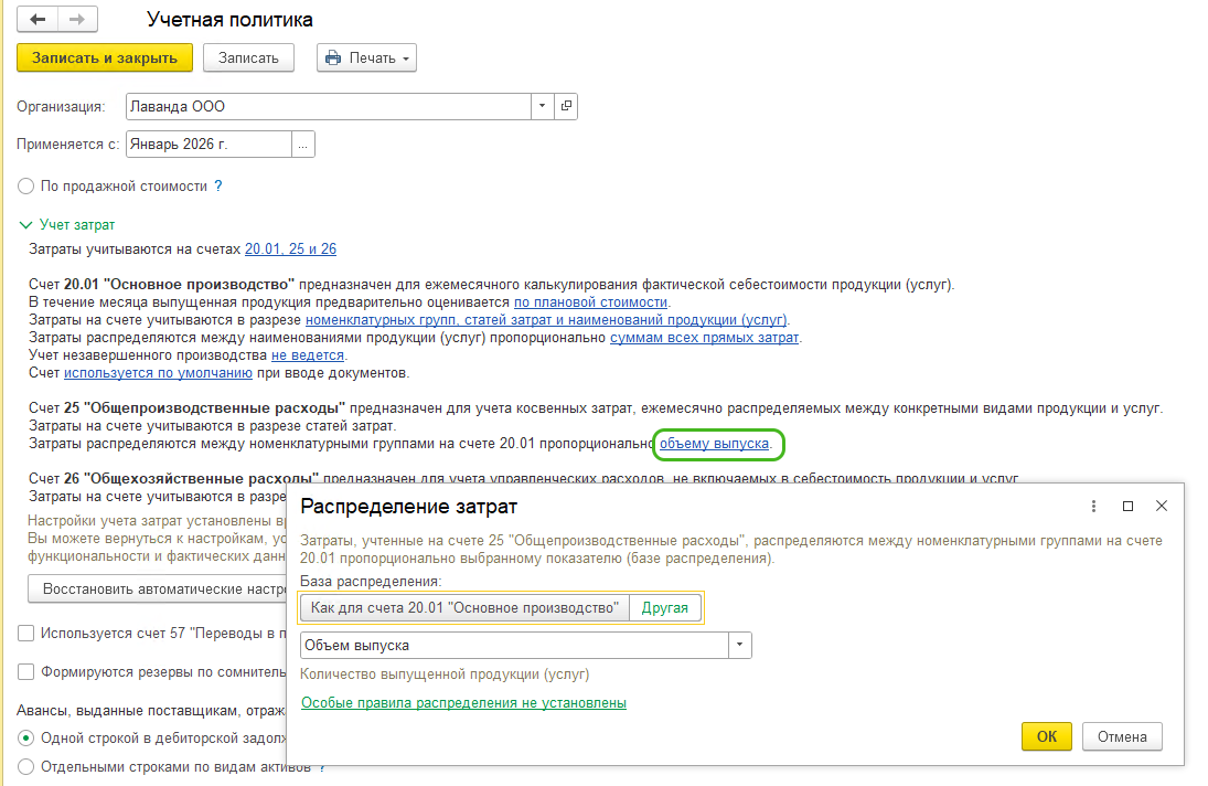 Раскройте настройку Учет затрат и откройте гиперссылку с настройкой базы распределения 25 счета