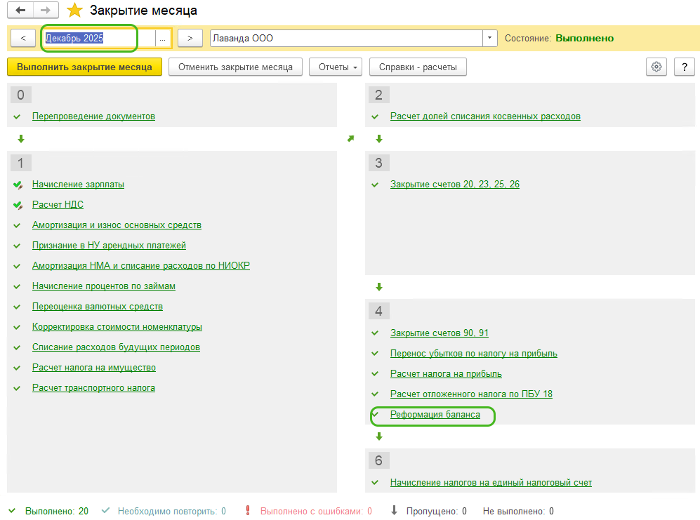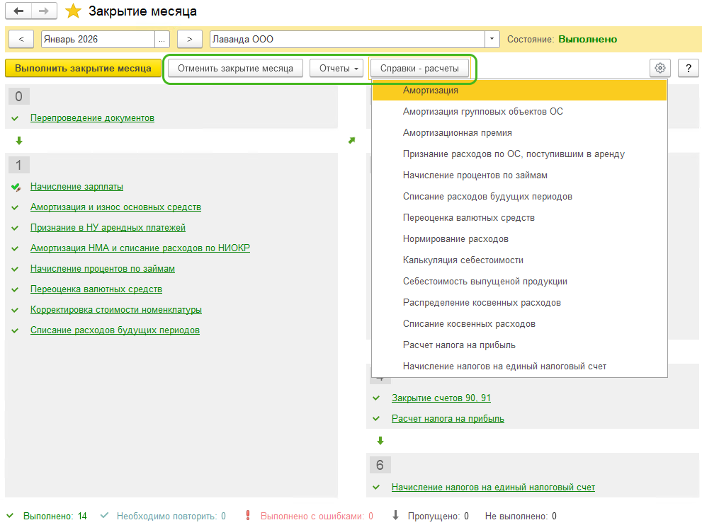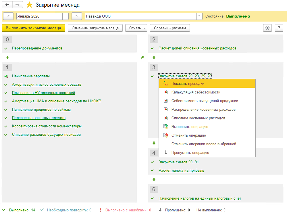 Об успешном выполнении регламентных операций будет свидетельствовать их окраска в зеленый цвет и галочки рядом с каждой операцией. При необходимости, кликнув на любую из них можно просмотреть проводки/справки-расчеты/документы. Также имеется возможность пропуска отдельных операций и повторного их выполнения.