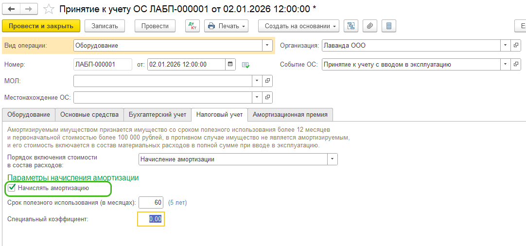 Или проблема может быть в настройке амортизации в НУ (вкладка Налоговый учет в документе Принятие к учету ОС). Там должна быть установлена галка Начислять амортизацию.