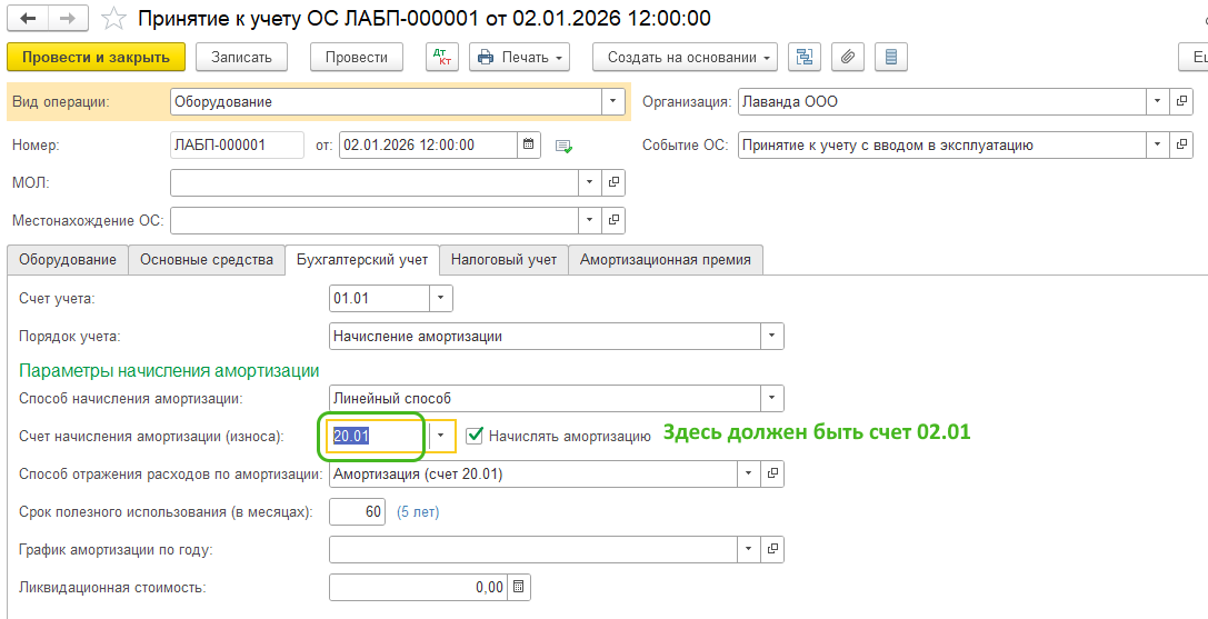 Проверьте правильность указания счета для начисления амортизации в документе принятия к учету ОС или НМА. Зачастую там вместо счета 02 указывают 20, 25, 26 счета, а это приведет к ошибке.