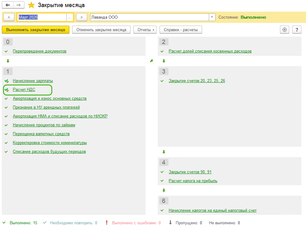 Некоторые регламентные операции требуется выполнять не каждый месяц. Например, операция Расчет НДС требуется раз в квартал, как и расчет имущественных. Поэтому этих операций в январе мы не увидим, а вот в марте они появятся, если вы уплачиваете эти налоги.