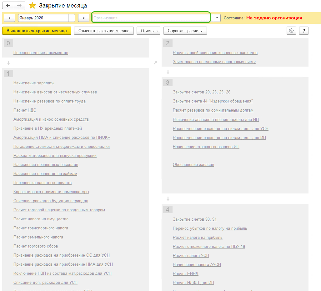 Если в базе ведется учет по нескольким организациям, в Закрытии месяца можно будет выбрать нужную и провести регламентные операции только по ней.