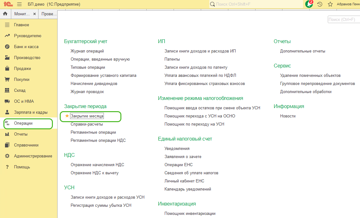 Помощник Закрытие месяца можно найти в разделе Операции – Закрытие периода