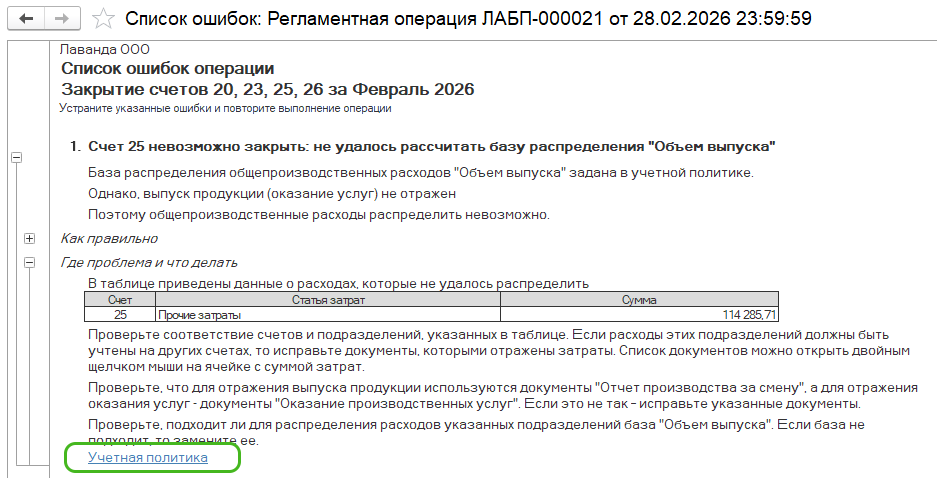 Проблемы с закрытием счета 25 могут возникнуть из-за некорректной настройки Учетной политики, в которую можно перейти из подсказки программы