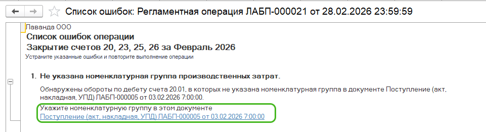 Не указана номенклатурная группа производственных затрат в документе. При такой ошибке помощник покажет конкретный документ, где не хватает аналитики и вы сможете зайти в него из ошибки и дополнить недостающими данными