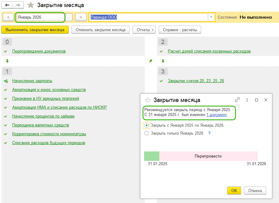Перед проведением регламентных операций программа предложит перепроведение документов. Обращаем Ваше внимание, если в документ были внесены изменения в прошедшем периоде и этот документ был проведен, то Закрытие месяца предложит выполнять перепроведение документов с момента проведения этого документа. Вы можете выбрать, требуется ли перепроведение.