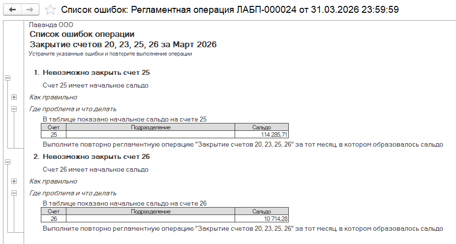 "Невозможно закрыть 20, 23, 25,26 счет": такая ошибка возникает, если есть сальдо на начало закрываемого месяца. Необходимо проверить по ОСВ, в каком периоде возникло сальдо и повторно закрыть этот месяц и все последующие, вплоть до текущего месяца. Такая ошибка возникает из-за нарушения последовательности проведения документов и исправляется только возвращением в период возникновения проблемы и повторного выполнения регламентных операций. Также могут повлиять ручные корректировки в проводках и наличие Операций, введенных вручную.