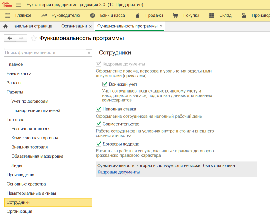 Прежде всего, нужно включить функции расчета зарплаты, которые вам могут понадобиться. В 1С:Бухгалтерия предусмотрена работа с кадровыми документами (отключить нельзя). А вот остальные функции проставьте на свое усмотрение (раздел «Главное» — Настройки — Функциональность — Сотрудники).