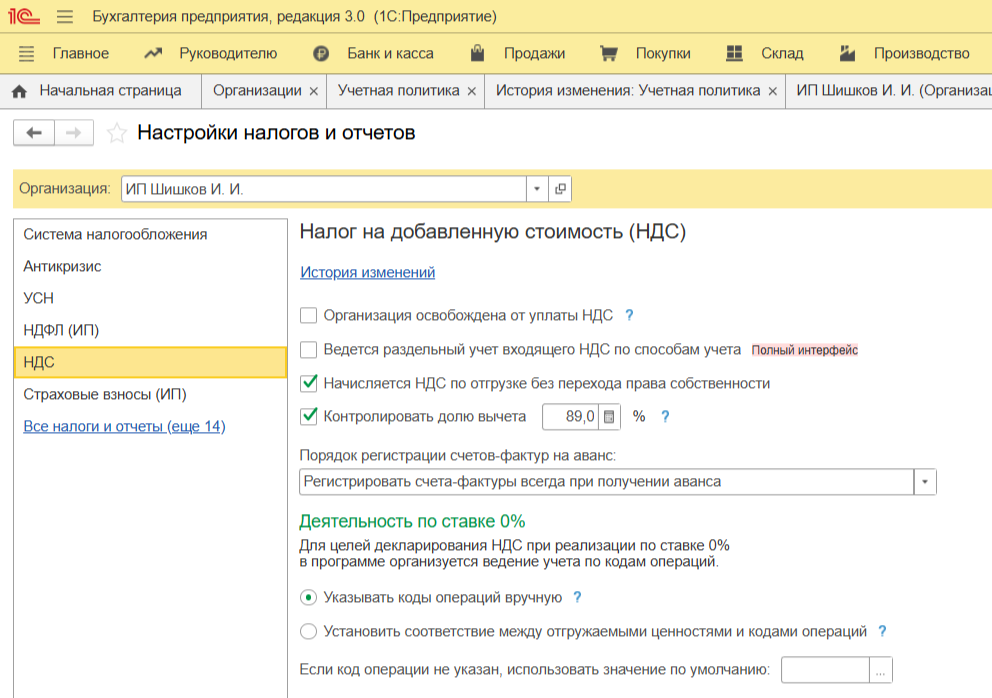 Ключевые настройки в 1С для ИП на ОСНО (вкладка «Главное» — Налоги и отчеты).
