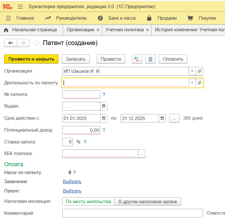Патент требует ведения раздельного учета — доходы от деятельности по патенту должны быть отделены от доходов по УСН или ОСНО (если режимы совмещаются). Настройка ПСН в 1С включает:
