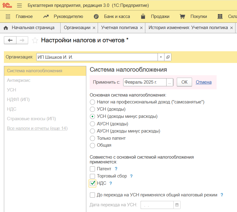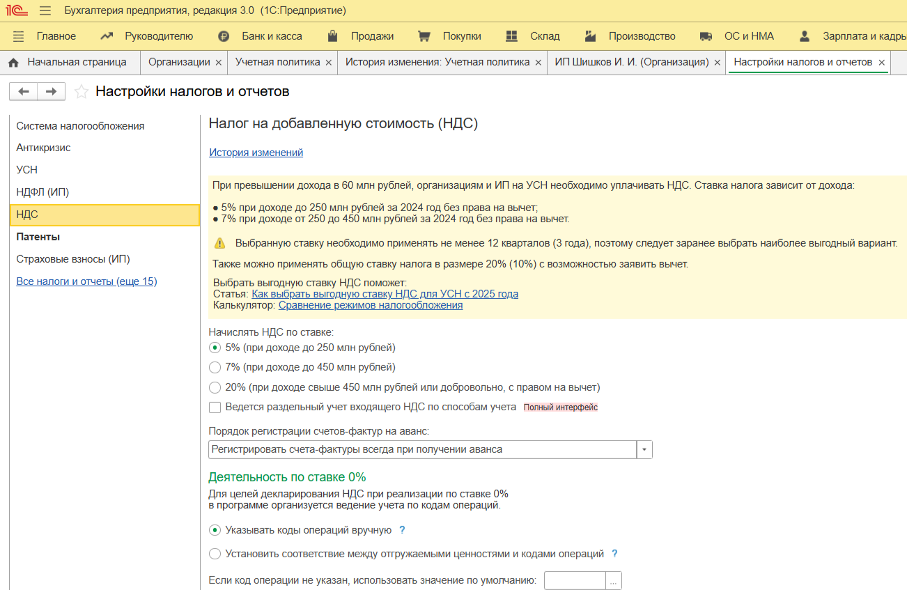 УСН — самый популярный режим у ИП. Но поскольку ИП на УСН с 2025 года при определенных условиях становятся плательщиками НДС, не забывайте это отметить в настройках.