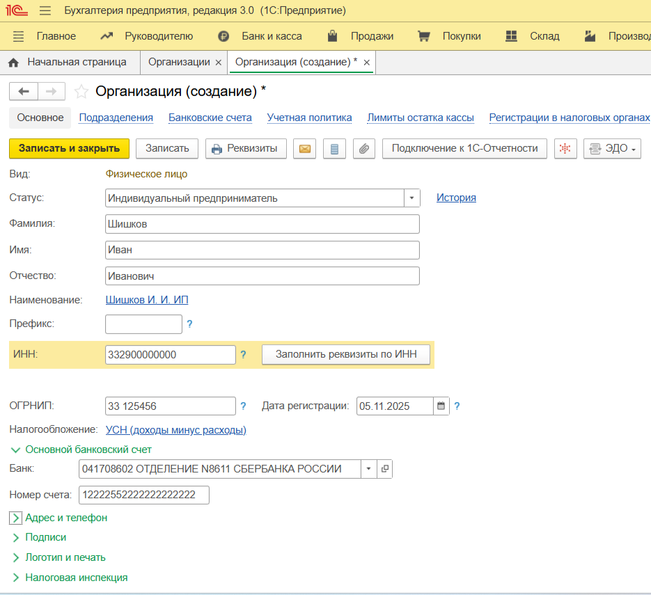 Все данные вводятся в разделе «Главное» — Организации. В программе предприниматель учитывается как «Организация», но с пометкой «ИП».