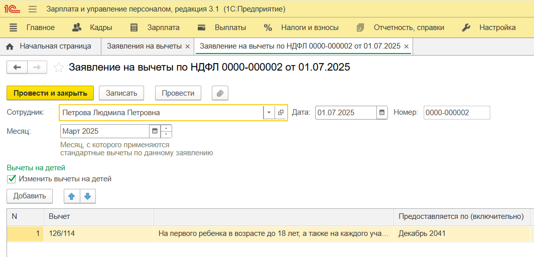 Заявление и документы. Убедитесь, что сотрудник вовремя подал документы на вычет, а вы на их основании правильно ввели заявление в 1С:ЗУП (вкладка «Налоги и взносы» — Заявления на вычет либо выбрать сотрудника на вкладке «Кадры» — Сотрудники, а уже в его карточке нажать интерактивную ссылку «Налог на доходы» — ссылка «Ввести новое заявление на стандартные вычеты»). Если заявление не зафиксировано в 1С или введено задним числом, НДФЛ будет завышен. Рекомендуем сразу же проставить месяц, до которого действует вычет, чтобы не проверять в начале каждого года этот показатель.