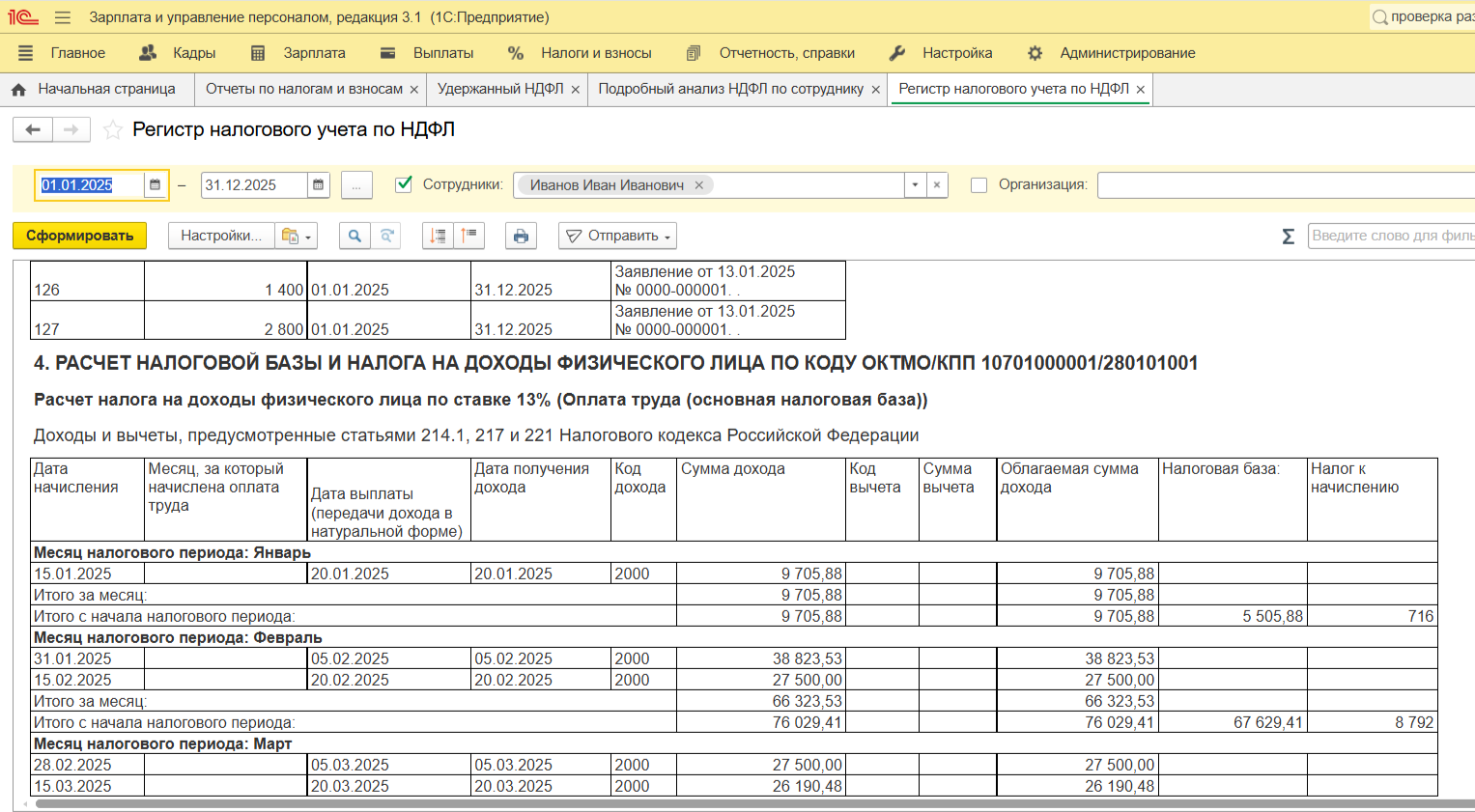 регистр «Подробный анализ НДФЛ по сотруднику»: этим отчетом удобно воспользоваться, когда есть уверенность, что именно по определенному сотруднику ошибка в расчетах.