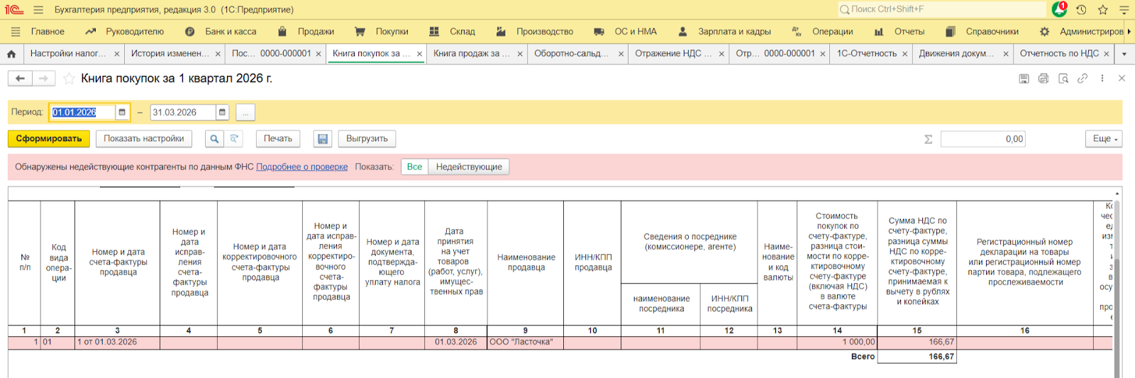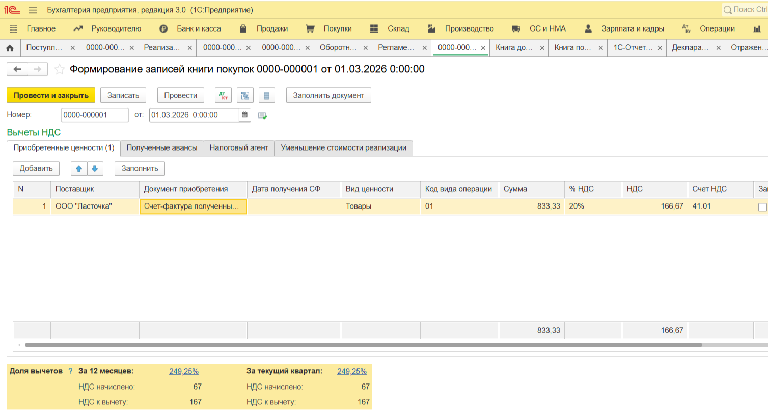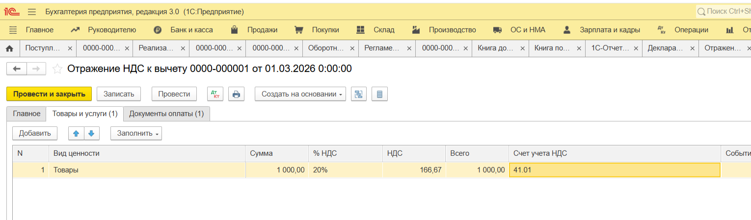 По остатку товара после перехода на уплату НДС создаем документ «Отражение НДС к вычету»: Операции — НДС, заполняя все вкладки в документе. Дата в документе равна дате перехода на уплату НДС. В нашем случае 01.03.2026. После этого налог попадает в Книгу покупок, чтобы заявить его к вычету.