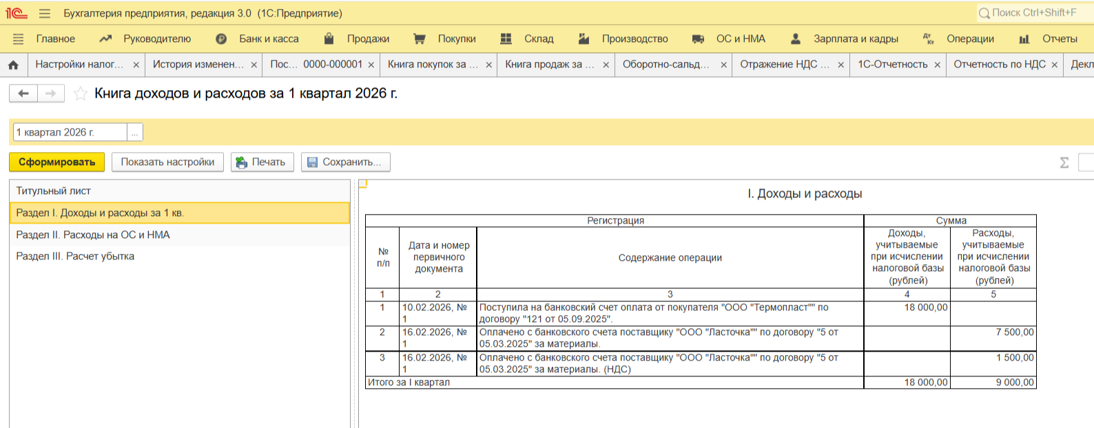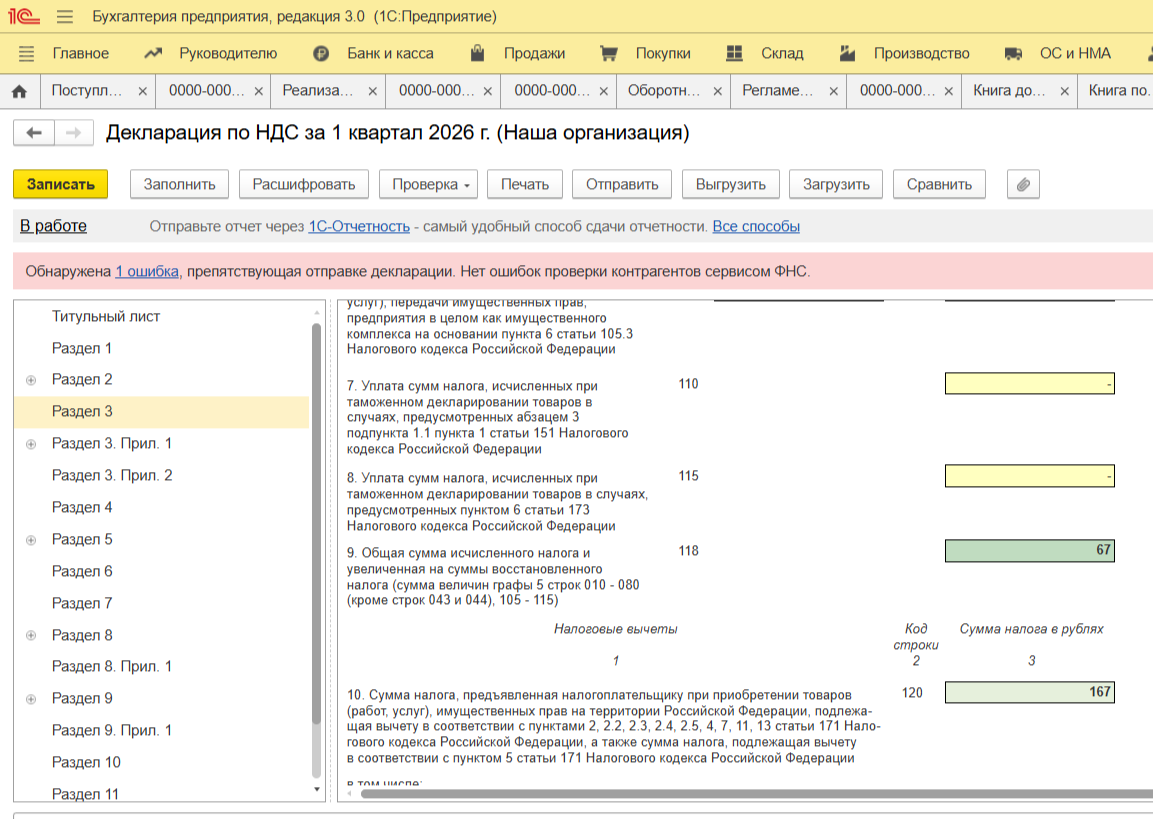 В конце каждого квартала используйте Анализ по учету НДС: вкладка «Отчеты» — Анализ учета. Он поможет проверить корректность данных. После чего на вкладке «Отчеты» — НДС — Отчетность по НДС произведите расчет налога автоматически с формированием Книги покупок/продаж, а также декларации. По завершении подайте декларацию в электронном виде.