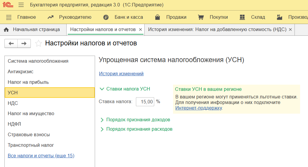 На вкладке «Главное» — Настройки — Налоги и отчеты создайте новую запись в истории учетной политики, начиная с 1-го числа следующего месяца, в котором был превышен лимит дохода.