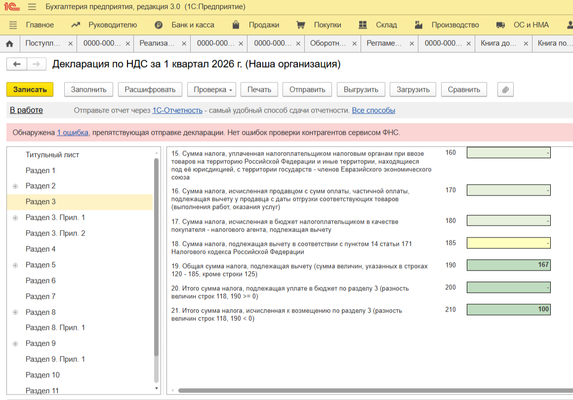 После всех выполненных операций и закрытия периода (всех месяцев отчетного квартала) формируем Декларацию по НДС. В ней отражена реализация с НДС и НДС к возмещению по остатку товара на момент перехода на уплату налога.