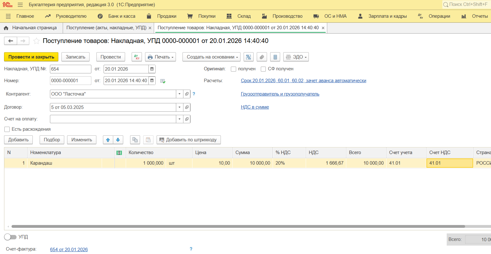 Это самое сложное! Рассмотрим в качестве примера поступление товара с НДС в период освобождения «упрощенца» от этого налога. Счет учета НДС тут 41.01, потому что он входит в себестоимость товара.