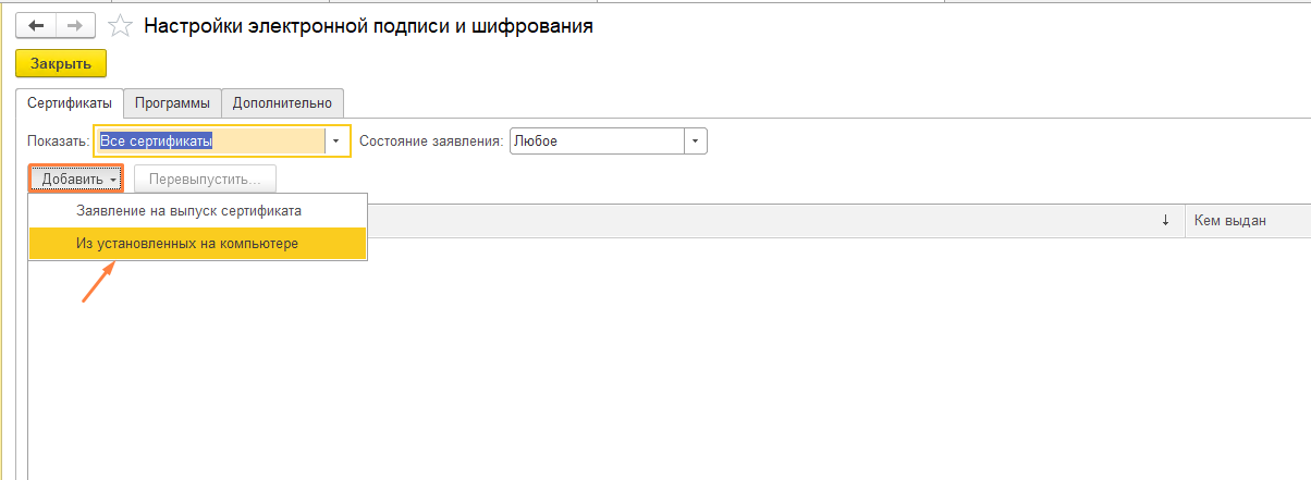 Шаг 2. Добавление сертификата в справочник. Теперь программа должна увидеть ваш ключ. В этом же окне перейдите по гиперссылке «Настройки электронной подписи и шифрования» (вкладка «Сертификаты» — Добавить — Из установленных на компьютере). Если открывшийся список пуст, отметьте «Показывать все сертификаты». Выберите нужную подпись — и «Далее».