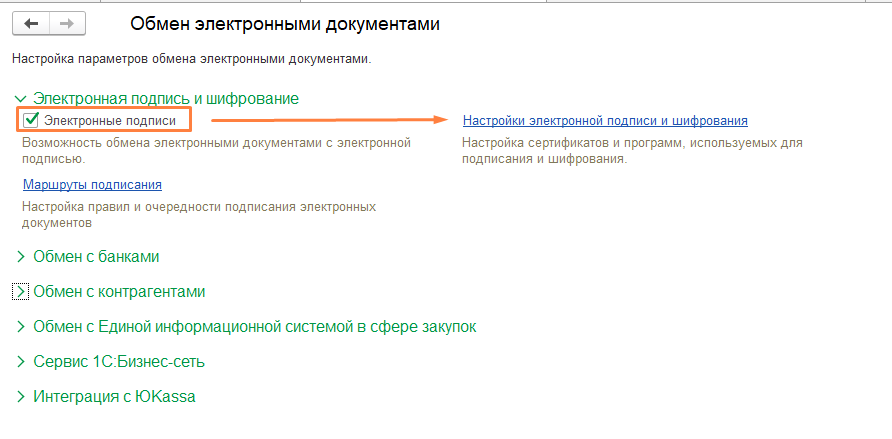 Шаг 1. Активация функций криптографии. Для начала нужно убедиться, что в вашей базе включена сама возможность использования цифровых подписей (вкладка «Администрирование» — Обмен электронными документами — блок «Электронные подписи и шифрование»). Галочка напротив пункта «Электронные подписи» обязательна. Если она уже стоит — переходите к следующему шагу.