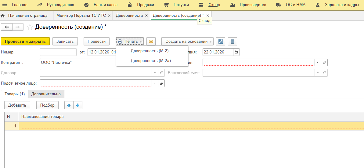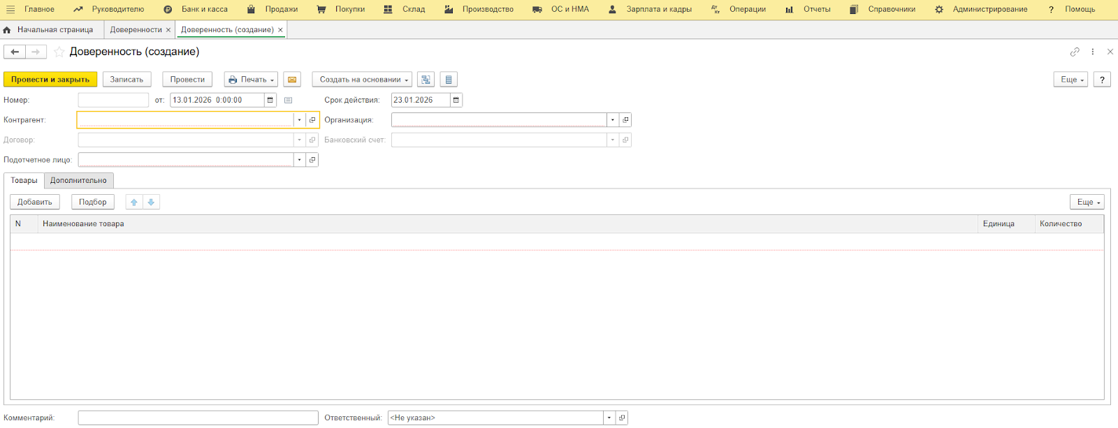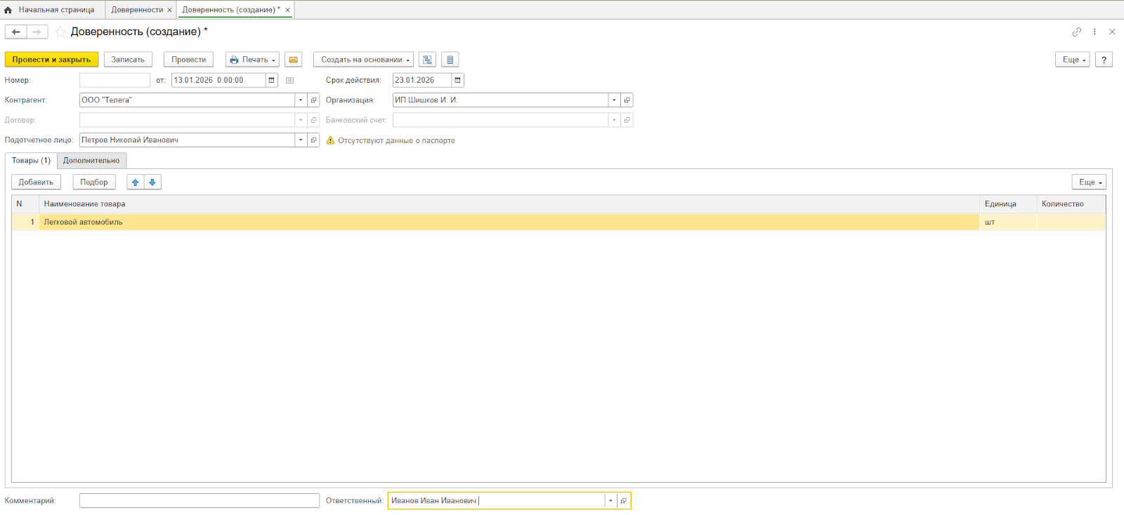 Когда все поля заполнены и проверены, документ можно «Провести и закрыть». После проведения доверенность готова к печати и передаче сотруднику.