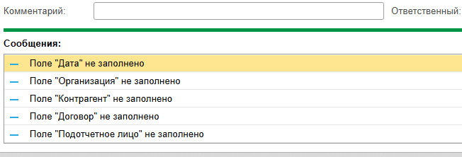 Если вы попытаетесь провести документ, не заполнив поля, программа подсветит их список.