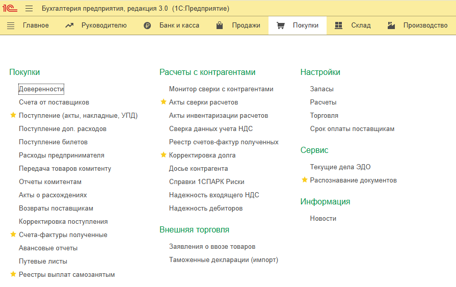 Для того, чтобы найти, где в 1С доверенность, сначала нужно открыть соответствующий раздел в программе. Переходим на вкладку «Покупки».