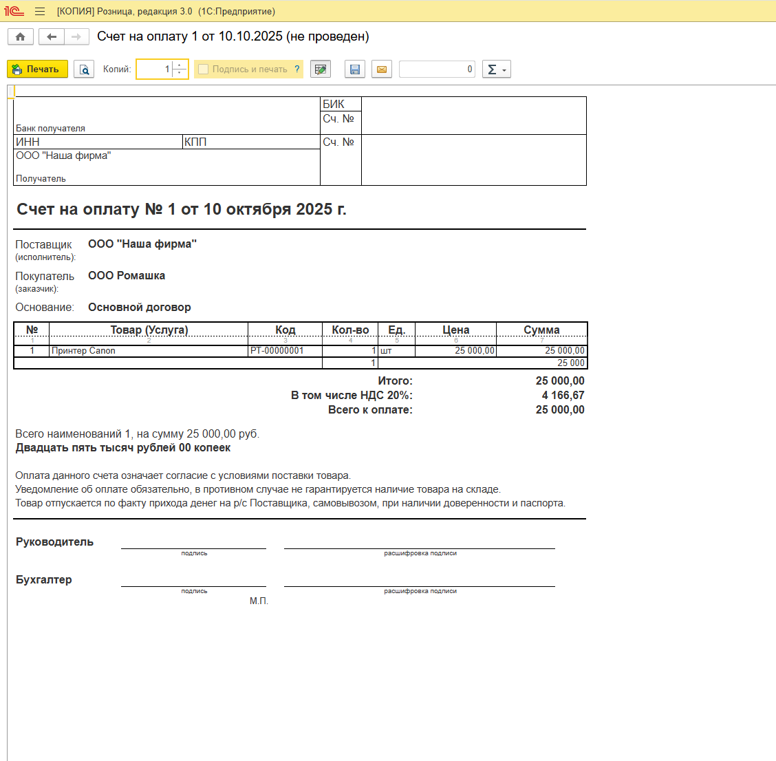 Мы выяснили, как в 1С сформировать счет на оплату. Его создание — это простой и удобный процесс, который не требует специальных знаний. Благодаря автоматическому заполнению реквизитов и встроенным возможностям печати и отправки документов, система помогает ускорить работу и сократить количество ошибок. Используя 1С, вы можете формировать счета за считанные минуты, а также хранить всю историю взаимодействия с клиентами в одном месте. Это делает учет более прозрачным, а бизнес — более организованным и эффективным.