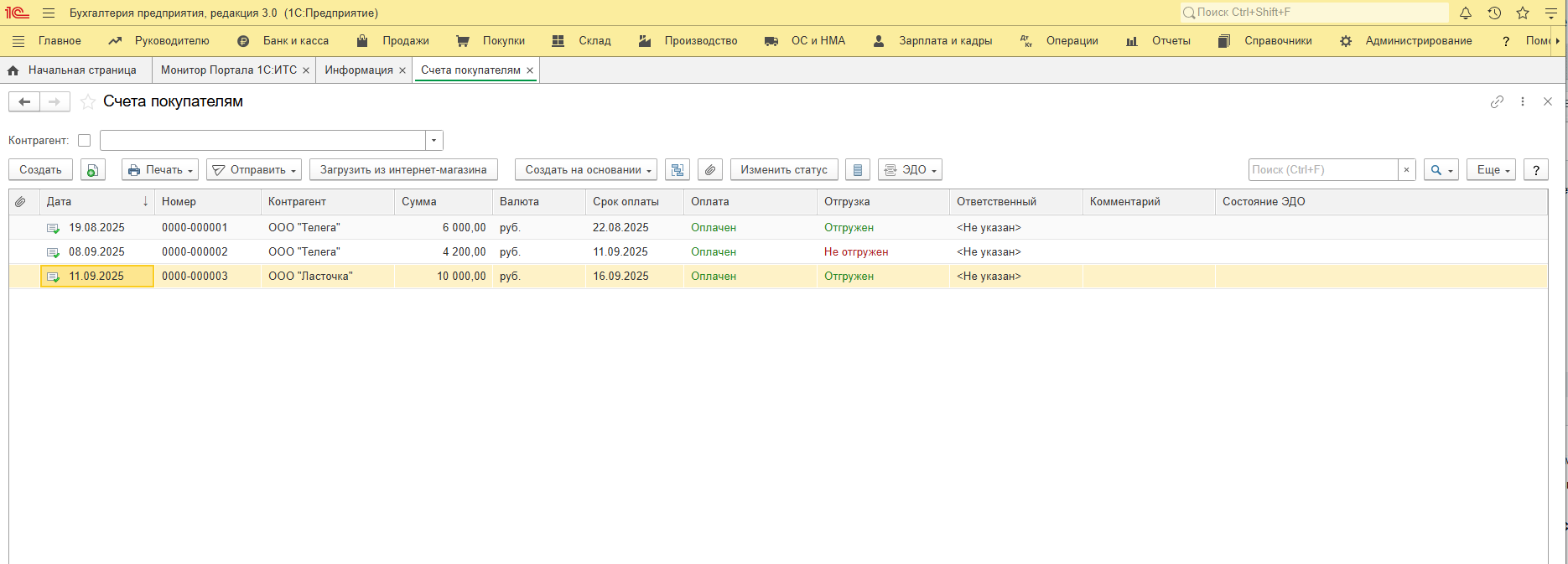 1. Затем выберите подраздел «Заказы покупателей». В журнале заказов найдите и выделите тот заказ, для которого необходимо создать счет.