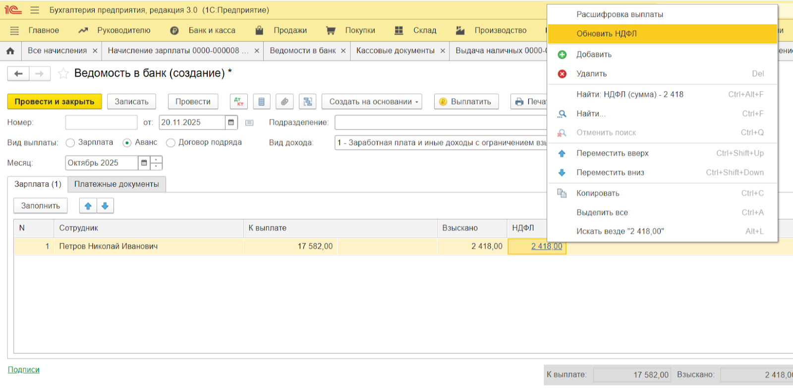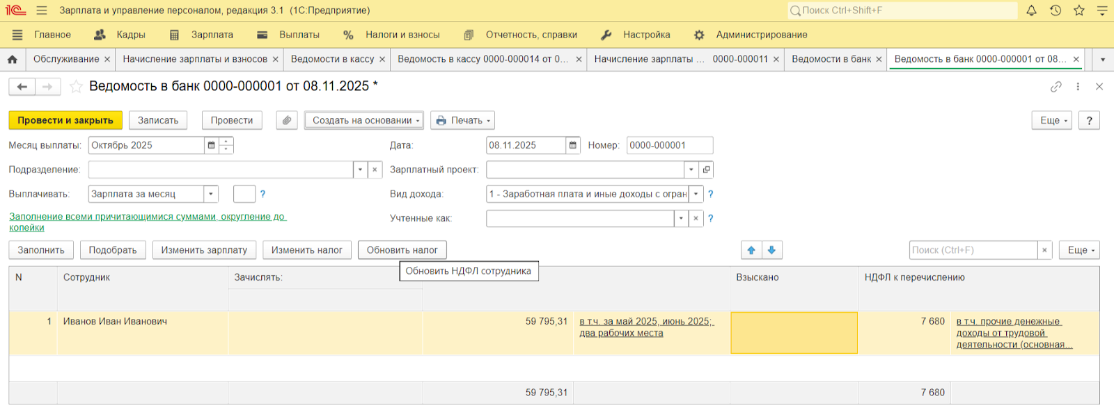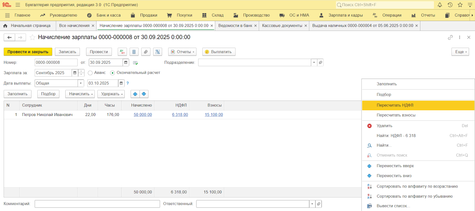Зафиксировать верные операции. Заново проведите исправленные документы, а затем последовательно перепроведите все те документы, которые были распроведены на первом этапе. Программа автоматически пересчитает НДФЛ на основании исправленных данных. Этот шаг обеспечивает правильное отражение данных в учетных регистрах НДФЛ и корректное формирование отчетности (6-НДФЛ).