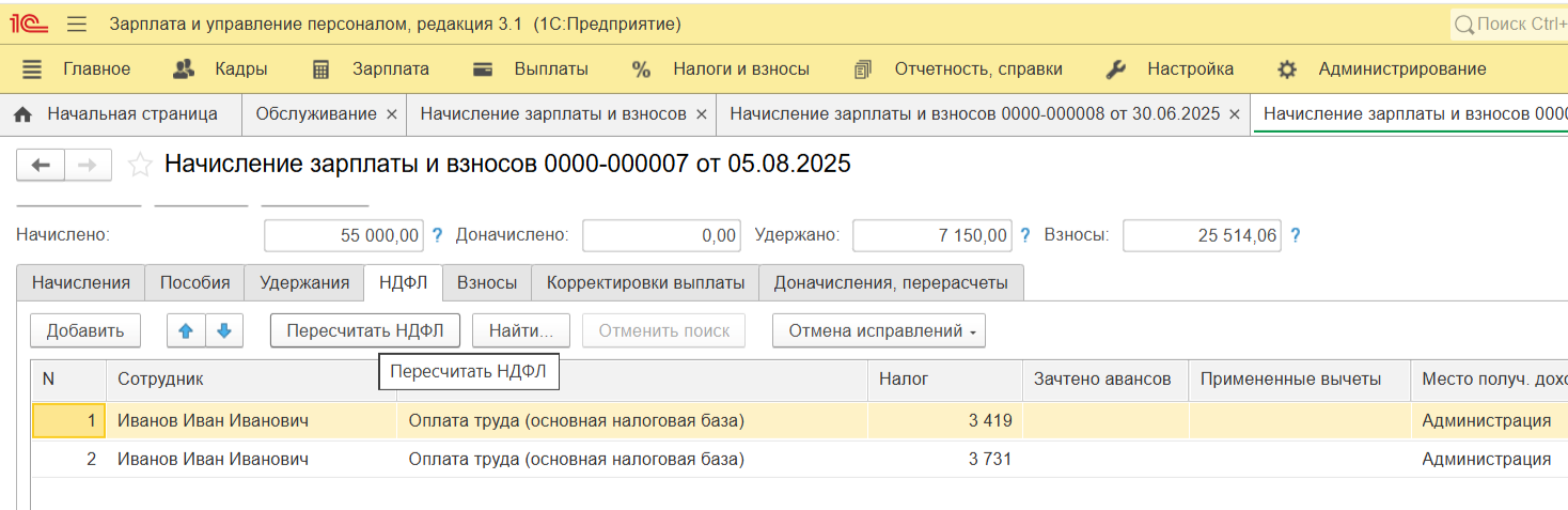 В 1С:ЗУП — «Начисление зарплаты и взносов» — вкладка «НДФЛ» — кнопка «Пересчитать НДФЛ».