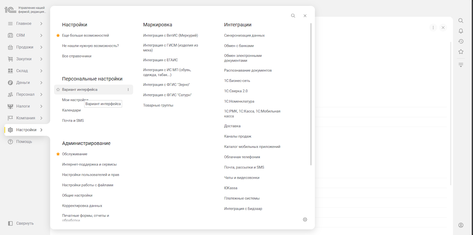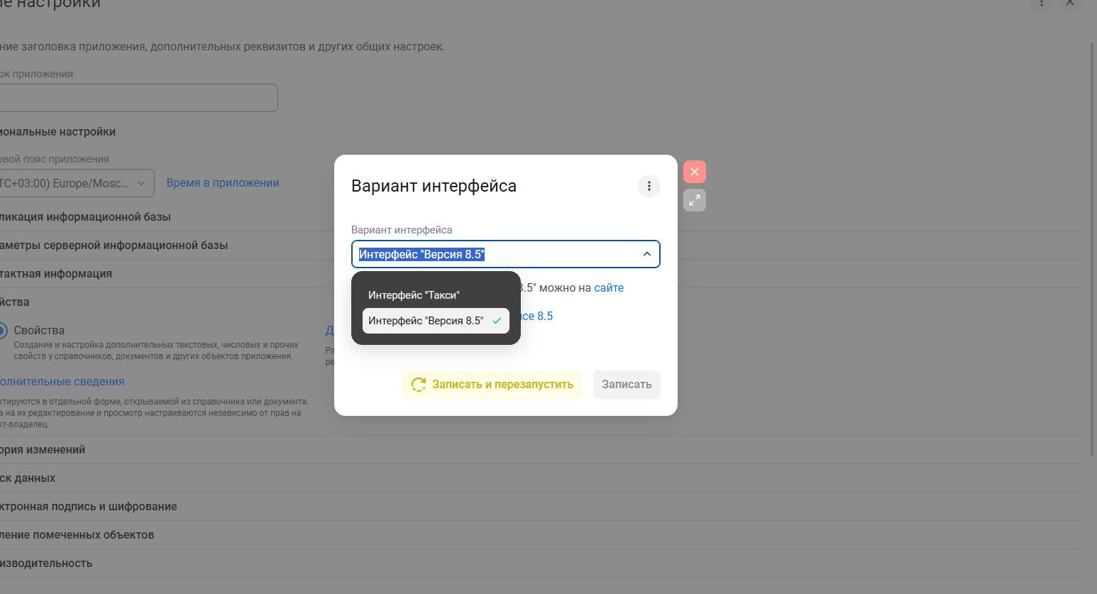 В открывшемся окне выберите «Интерфейс “Такси”» и нажмите «Записать и перезапустить». После перезапуска конфигурации интерфейс изменится.