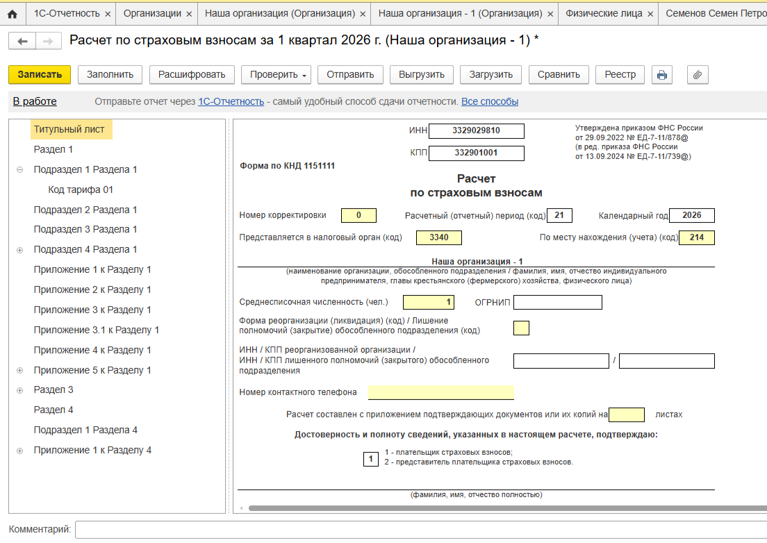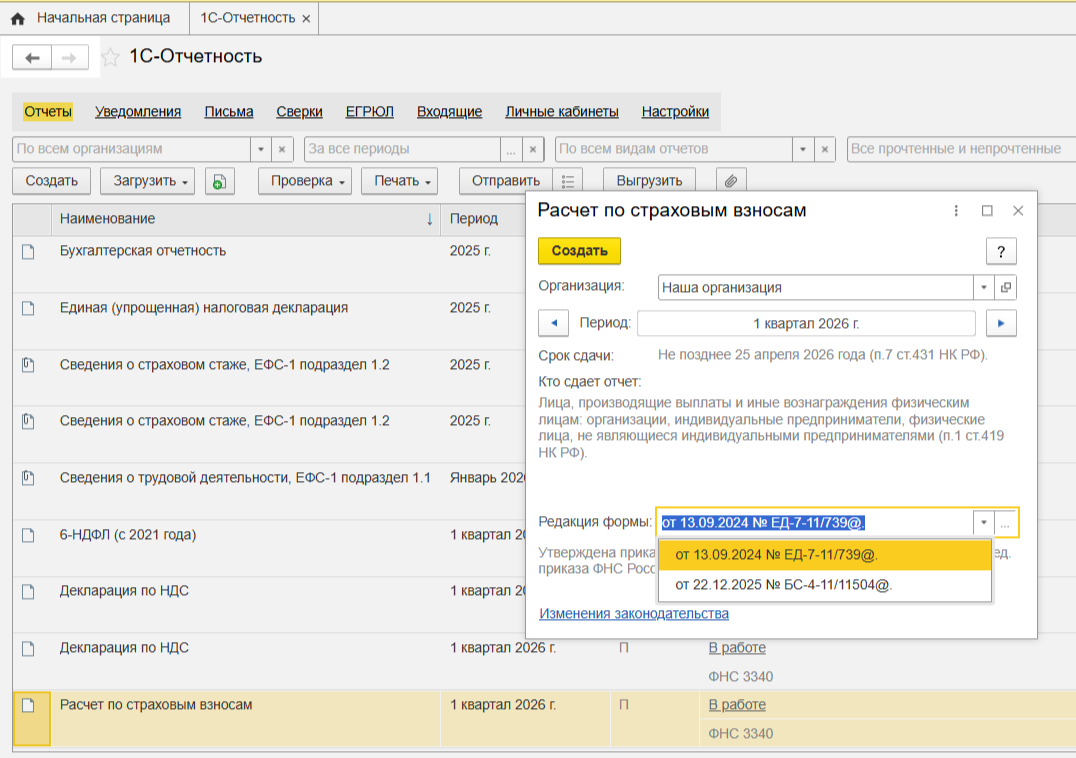 Чтобы запустить процесс, перейдите в 1С-Отчетность1С:ЗУП: Создать — Расчет по страховым взносам), укажите период — например, 1 квартал 2026 года.