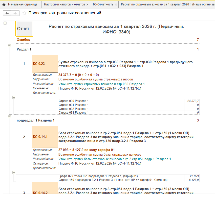 Шаг 3. Проверить контрольные соотношения. Налоговая проверяет отчет по четким алгоритмам, и вы можете сделать то же самое заранее. Самый надежный способ — встроенная проверка в 1С.