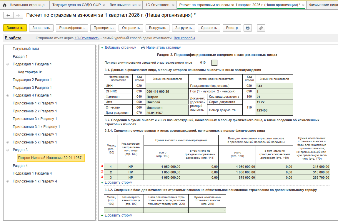 • Нулевой РСВ. Если в компании числится только директор и деятельности не было, программа все равно формирует отчет, и сдать его нужно обязательно. А с 2026 года за директора даже без зарплаты нужно перечислить взносы исходя из МРОТ. Поэтому отчет как таковой не будет нулевым.